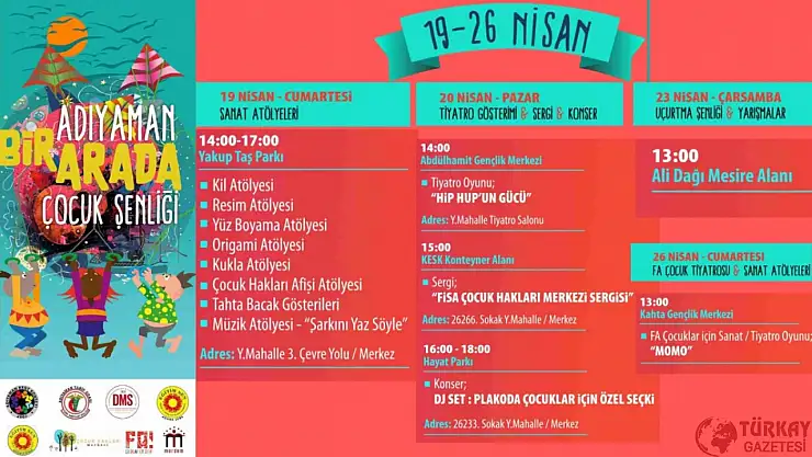 Eğitim Sen Adıyaman Şubesi’nin öncülüğünde birçok sivil toplum kuruluşunun katkısıyla 19-26 Nisan tarihleri arasında gerçekleştirilecek şenlikte, farklı yaş gruplarına hitap eden atölyeler, tiyatro gösterimleri, konserler, sergiler ve açık hava etkinlikleri yer alacak.