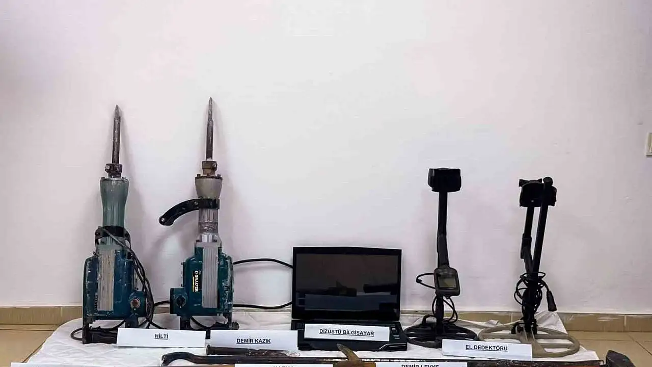 Operasyonda, kaçak kazıda kullanılan 2 el dedektörü, 1 mini dedektör, 1 yön gösterici, 1 dizüstü bilgisayar, 2 hilti ve çok sayıda kazı malzemesi ele geçirildi.
