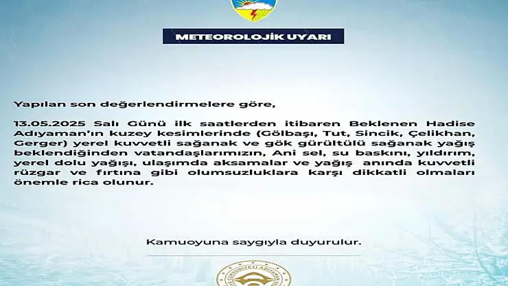 13.05.2025 Salı Günü ilk saatlerden itibaren Beklenen Hadise Adıyaman'ın kuzey kesimlerinde Gölbaşı, Tut, Sincik, Çelikhan, Gerger yerel kuvvetli sağanak ve gök gürültülü sağanak yağış beklendiğinden vatandaşlarımızın, Ani sel, su baskını, yıldırım, yerel dolu yağışı, ulaşımda aksamalar ve yağış anında kuvvetli rüzgâr ve fırtına gibi olumsuzluklara karşı dikkatli olmaları önemle rica olunur.