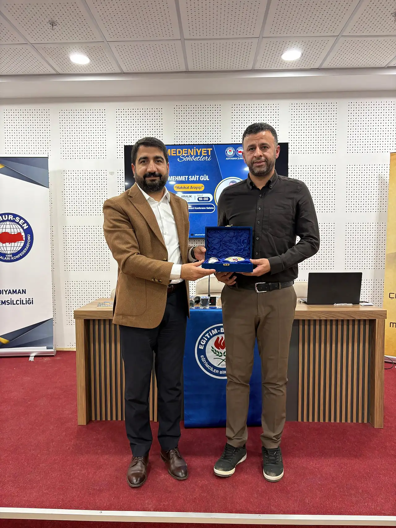 Program öncesinde kısa bir konuşma yapan Memur-Sen ve Eğitim-Bir-Sen Adıyaman Şube Başkanı Mehmet Demir; “Medeniyet Sohbetleri, şubemizin 2014 yılından beri gelenek haline getirdiği, üyelerimizi sosyal kültürel aktivitelere teşvik eden, onların bilgi birikimlerini geliştiren ve muhabbet ortamlarında buluşturan etkinliklerinden biridir. Daha önce hem yerel hem ulusal düzeyde birçok konuğumuzun ağırlandığı bu etkinlikte bugün kıymetli kardeşim Eğitimci-Yazar Mehmet Sait Gül’ü misafir etmekten ve onun birikiminden istifade ediyor olmaktan mutluluk duyuyoruz. Rabb’im nasip ederse benzer programlarımız devam edecektir. Bu güzel etkinliğe katılım sağlayarak bizleri onurlandıran tüm dostlara, üyelerimize gönülden teşekkür ediyorum.” dedi.