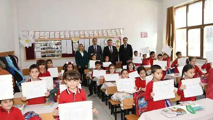 Karne dağıtım törenine katılmak üzere Şehit Mehmet Kılınç İlkokuluna gelen Vali Mahmut Çuhadar, öğrenciler tarafından çiçeklerle karşılandı.