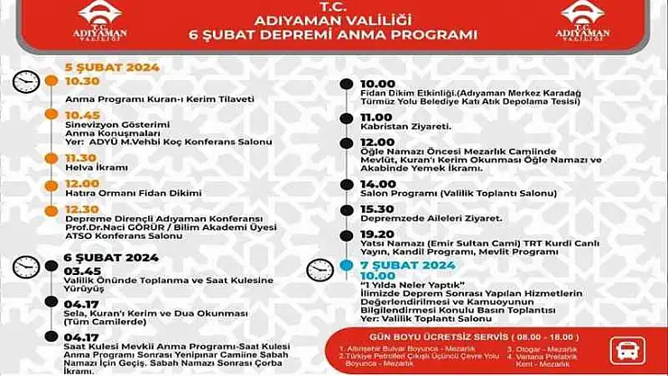 Adıyaman Valiliği tarafından düzenlenecek olan program 5 Şubat tarihinde sabah 10:30’da Kur’an-ı Kerim tilaveti ile başlayacak.