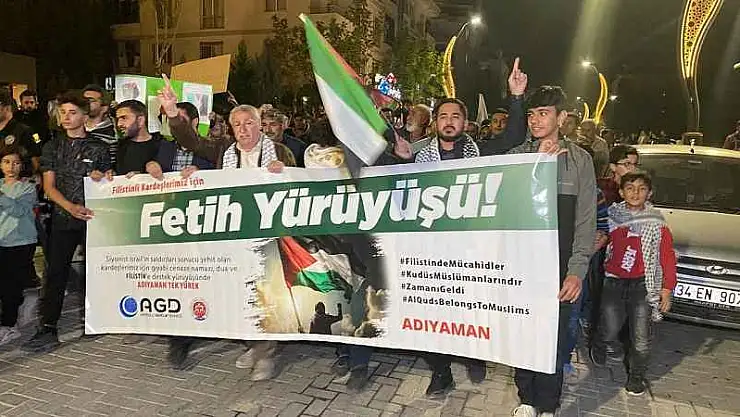 Anadolu Gençlik Derneği adıyaman Şubesi öncülüğünde bir araya gelen vatandaşlar Adıyaman Merkez Altınşehir Mahallesi Gökkuşağı Caddesi üzerinde yatsı namazı sonrası yürüyüş gerçekleştirdi. Yürüyüşte Filistin ve Türk bayrakları taşıyan grup, İsrail’e karşı sloganlar attı. Anadolu Gençlik Derneği Adıyaman Şube Başkanı Mehmet Gezici yaptığı açıklamada, "Dünyanın gözü önünde soykırım yaşanıyor. Her fırsatta insan haklarından dem vuran batı ve Amerika, tüm dünyanın gözleri önünde işlenen İsrail terörizmine hiçbir zaman karşı çıkmamıştır. Şimdi de bütün yüzsüzlükleriyle Filistin’e karşı insan haklarını ihlal ediyorsunuz saldırıları durdurun çağrısı yapıyorlar. Fakat onlara karşı biz Kudüs’ün Mescidi Aksa'nın özgürlüğüne giden yolda Filistinli kardeşlerimizle ve mücahitlerle omuz omuza olduğumuzu haykırmak için buradayız” diye konuştu.