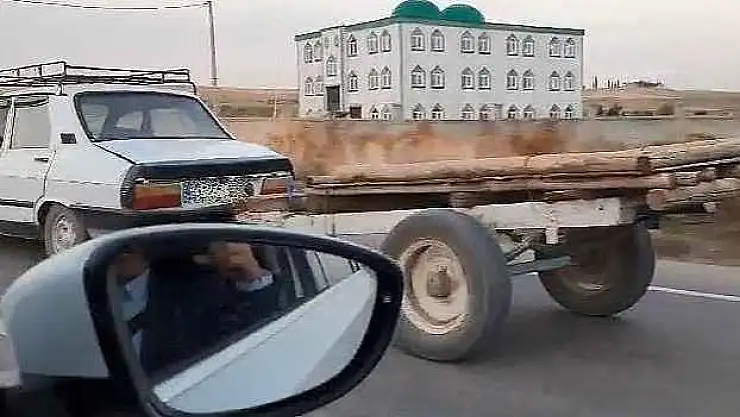 Adıyaman'ın Samsat ilçesinde bir vatandaş yük taşımak için otomobilinin arkasına at arabası bağladı. Samsat-Adıyaman karayolu Uzuntepe ile Taşkuyu arasındaki güzergahta görüntülenen otomobil, seyir halindeki sürücülerin dikkatinden kaçmadı. O anları ise başka bir sürücü görüntüledi.
