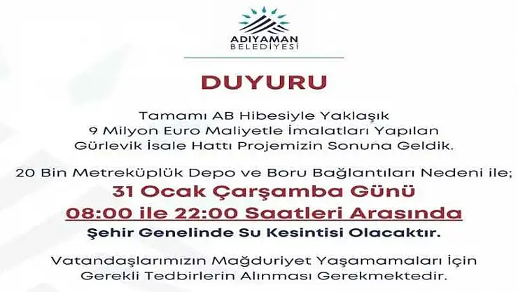 Adıyaman Belediyesinin sosyal medya hesabından yapılan açıklamada şu ifadelere yer verildi; “Tamamı AB Hibesiyle yaklaşım 9 milyon euro maliyetle imalatları yapılan Gürlevik ishale hattı projemizin sonuna geldik. 20 Bin metreküplük depo ve boru bağlantıları nedeniyle 31 Ocak Çarşamba günü saban 08:00 ile 22:00 saatleri arasında şehir genelinde su kesintisi olacaktır. Vatandaşlarımızın mağduriyet yamamamaları için gerekli tedbirleri almaları gerekmektedir”