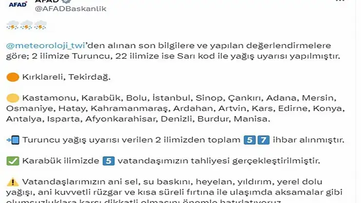 Paylaşımda, turuncu yağış uyarısı verilen 2 ilden 57 ihbar alındığı ve Karabük'te 5 kişinin tahliye edildiği belirtilerek, "Vatandaşlarımızın ani sel, su baskını, heyelan, yıldırım, yerel dolu yağışı, ani kuvvetli rüzgar ve kısa süreli fırtına ile ulaşımda aksamalar gibi olumsuzluklara karşı dikkatli olmasını önemle hatırlatıyoruz" ifadelerine yer verildi.