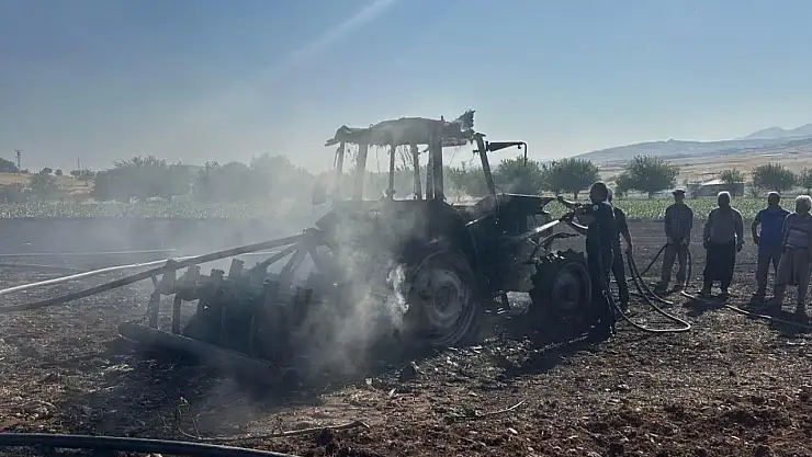 Adıyaman'da, meydana gelen anız yangınına müdahale etmek isteyen bir traktör yanarak hurdaya döndü.