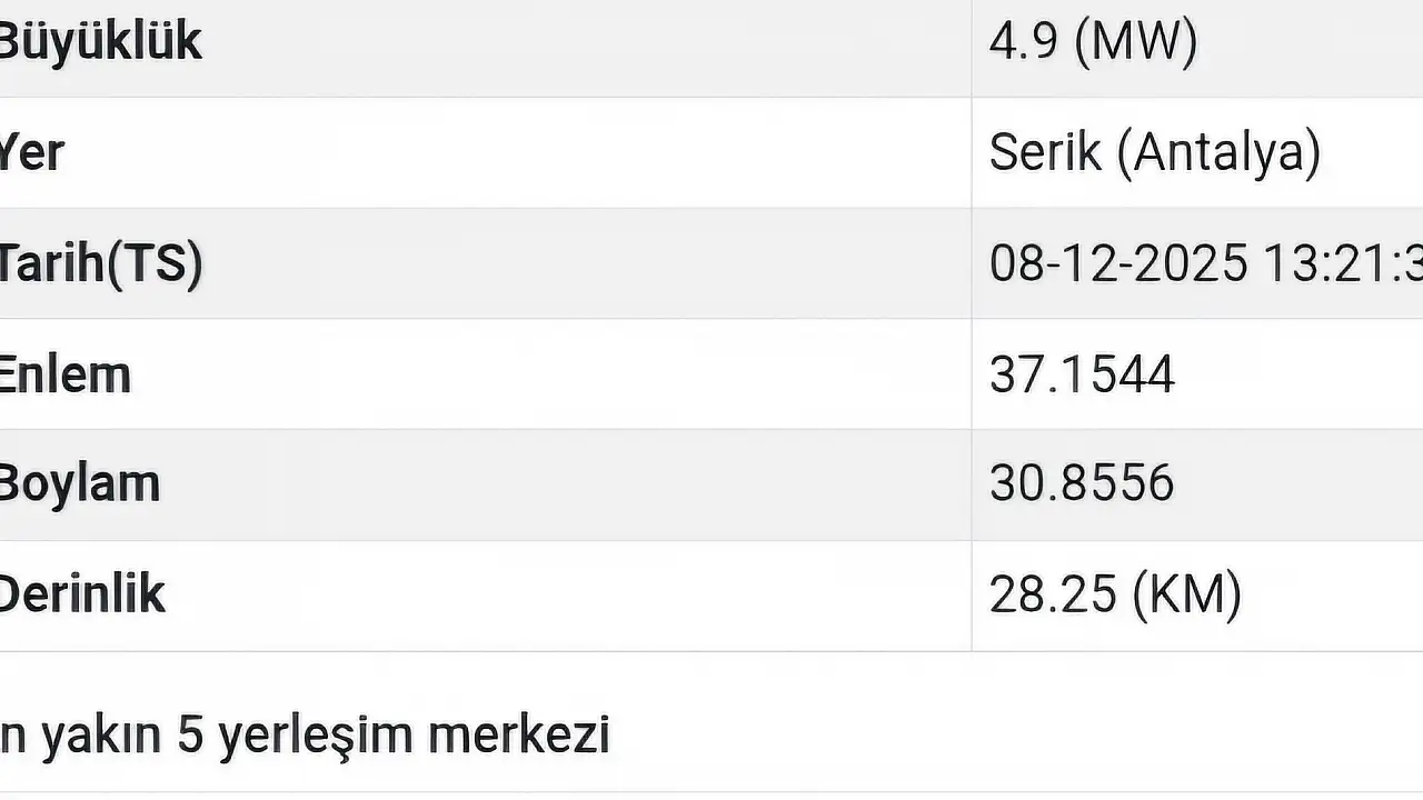 Antalya'nın Serik ilçesinde 08 Aralık 2025 tarihinde saat 13.21'de 4.9 büyüklüğünde bir deprem meydana geldi.