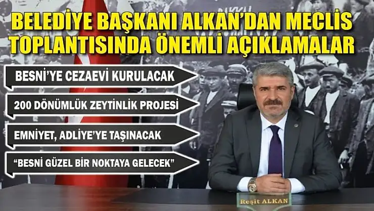 Besni Belediye Başkanı Reşit Alkan, Besni'ye yapılması gündemde olan Cezaevi, Zeytinlik Projesi, Emniyet müdürlüğü, Milli Eğitim Müdürlüğünün yeni yerlerine taşınması konularında açıklamada bulundu.