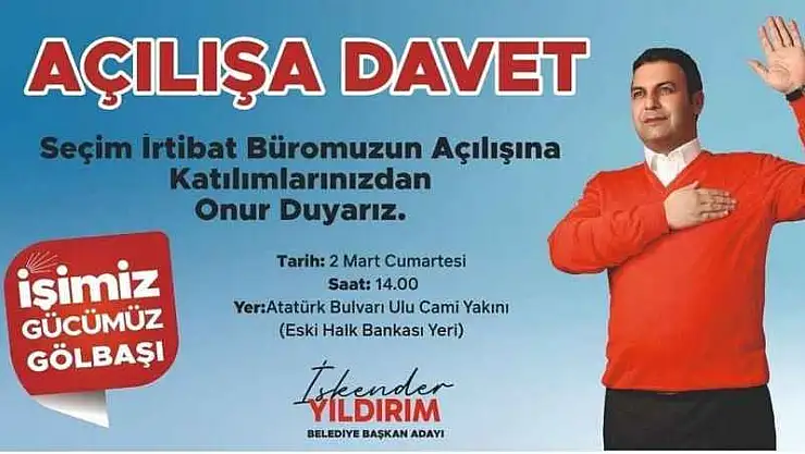 31 Mart yerel seçimleri öncesi yoğun bir seçim çalışması yürüten ve İşimiz Gücümüz Gölbaşı sloganı ile yola çıkan CHP Gölbaşı Belediye Başkan adayı İskender Yıldırım 2 Mart 2024 tarihinde yapılacak olan seçim irtibat bürosunun açılışına herkesi davet ederek, katılımlarımızdan dolayı onur duyarız dedi.