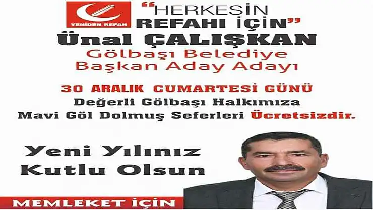 Yeniden Refah Partisi Gölbaşı Belediye Başkan Aday Adayı Ünal Çalışkan'ın desteğiyle 30 Aralık tarihinde Gölbaşı'nda şehir içi ulaşım bir günlüğüne vatandaşlara ücretsiz olacak.