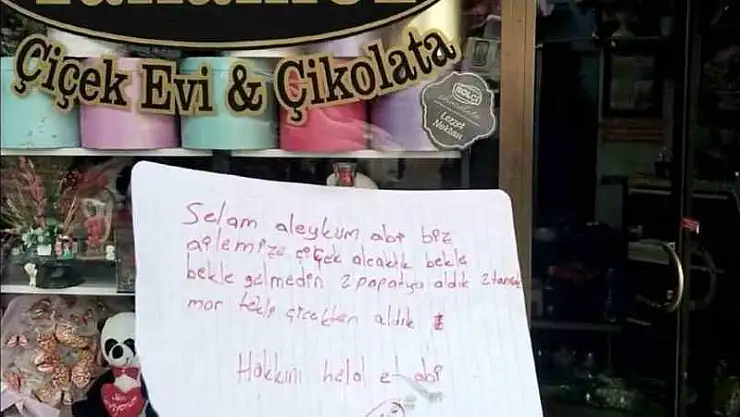 Çiçekçide ilgilenen kimseyi bulamayan çocuklar, kağıda yazdıkları "Selam Aleyküm abi biz ailemize çiçek alacaktık. Bekle bekle gelmedin, 2 papatya aldık 2 tane de mor tekli çiçek aldık. Hakkını helal et abi” notunu yazarak bıraktılar.