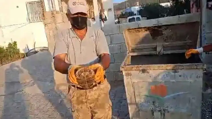 Kahramanmaraş'ın Türkoğlu ilçesinde görev yapan Türkoğlu Belediyesi Temizlik İşleri Müdürlüğü personeli, çöpe atılmış bir kaplumbağa fark etti. Çalışan, kaplumbağayı çöpten alarak doğaya bıraktı.