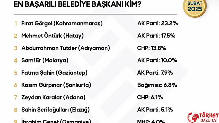 Şanlı Kamuoyu Araştırma Şirketi tarafından yapılan ve 4.000 kişilik bir katılımla gerçekleştirilen anket, Türkiye'nin en büyük felaketi olarak tarihe geçen 6 Şubat depreminin ardından, özellikle afetin ağır izlerini taşıyan illerde belediye başkanlarının sergilediği başarıları gözler önüne serdi. Depremden en çok etkilenen illerin başında gelen Hatay, Kahramanmaraş, Adıyaman ve Malatya gibi bölgelerde yapılan bu kamuoyu araştırması, bölge halkının gözünde en başarılı belediye başkanlarını belirledi.