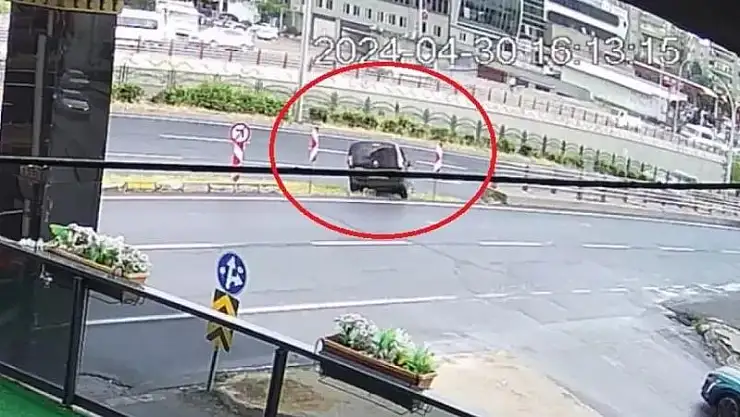 Görüntülerde, hafif ticari araç uyarı tabelasına çarpıp durduğu görüldü. Aracın trafik akışının yoğun olduğu ana yola girmemesi ve o yönden gelen araçların çarpmamasıyla şans eseri atlatıldığı görüldü.