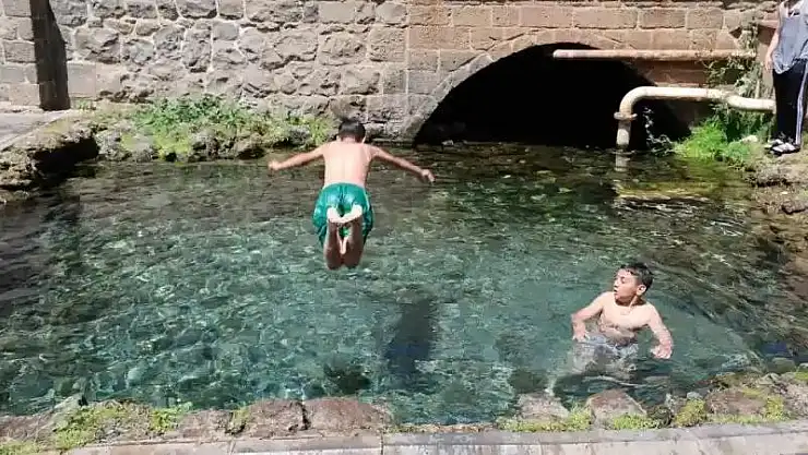 Diyarbakır'da hava sıcaklığının birden yükselmesiyle çocuklar, merkez Sur ilçesindeki Anzele Parkı'ndaki süs havuzuna girdi.