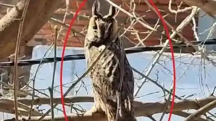 Diyarbakır'ın Çınar ilçesinde nesli tükenmekte olan boynuzlu baykuş, bir vatandaşın cep telefonu kamerasıyla kaydedildi.