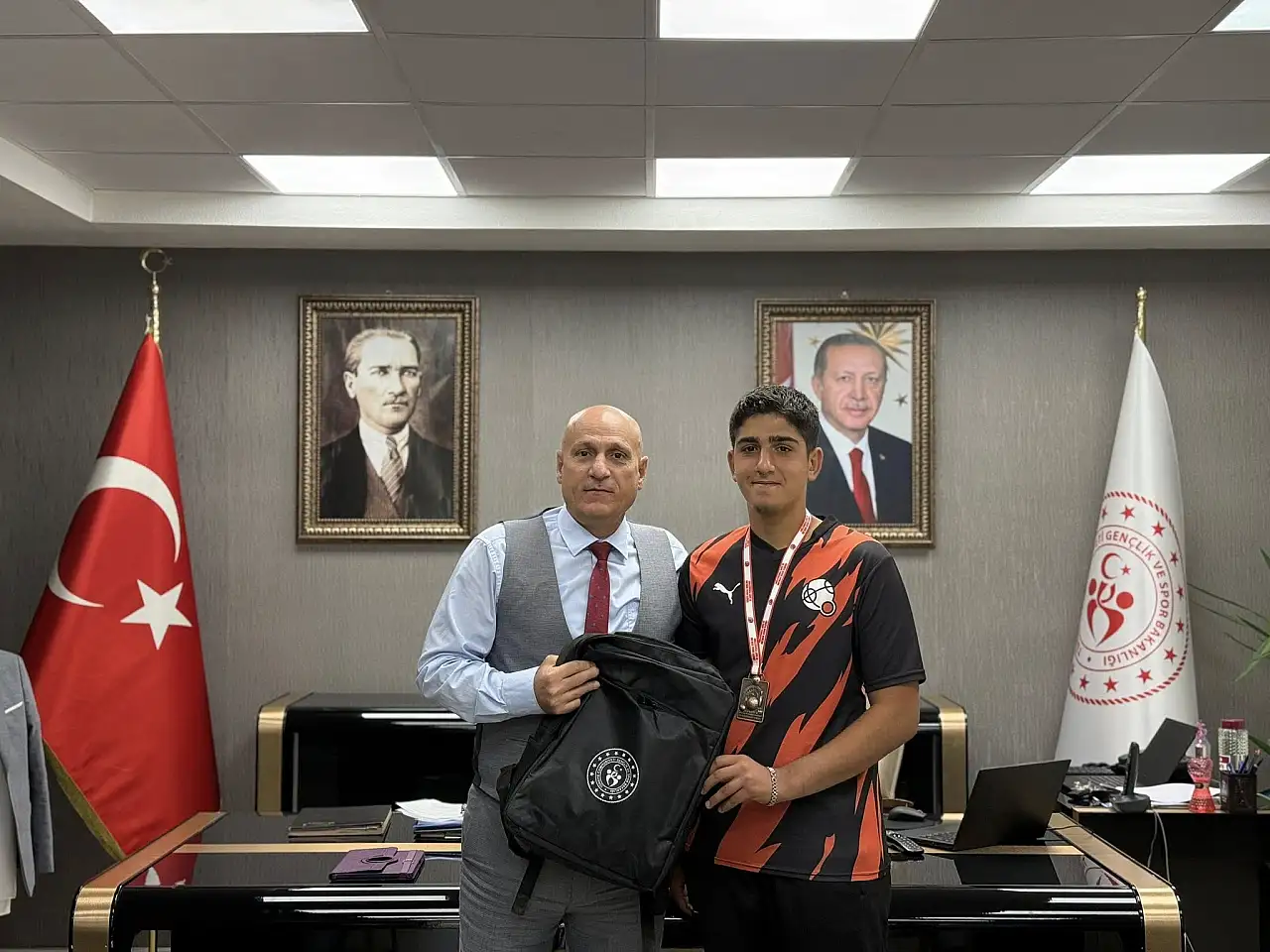 Elüstü başarılı sporcuya bazı hediyeler takdim etti.