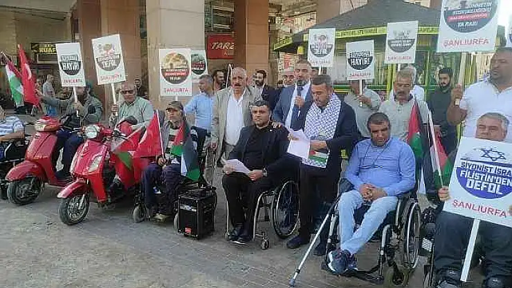 Şanlıurfa'da bir araya gelen engelli dernekleri üyeleri, İsrail'in Gazze'ye yönelik saldırılarını basın açıklamasıyla kınadı.