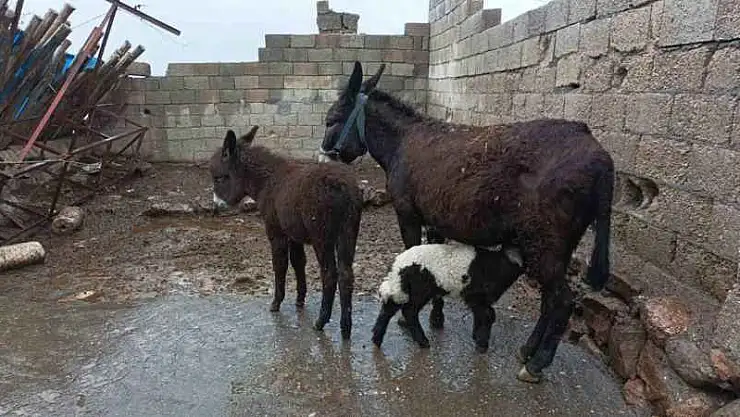 İlginç olay, Adıyaman’ın Besni ilçesine bağlı Tilek köyünde yaşandı. İbrahim Yakut’un koyunlarından birisi ikiz doğurdu. Kuzunun anne sütü yetmeyince, doğum yapan eşeğin sütünden emmeye başladı. Kuzuya eşek annelik yapıyor. Eşek hem kendi yavrusunu hem de kuzuyu emziriyor.