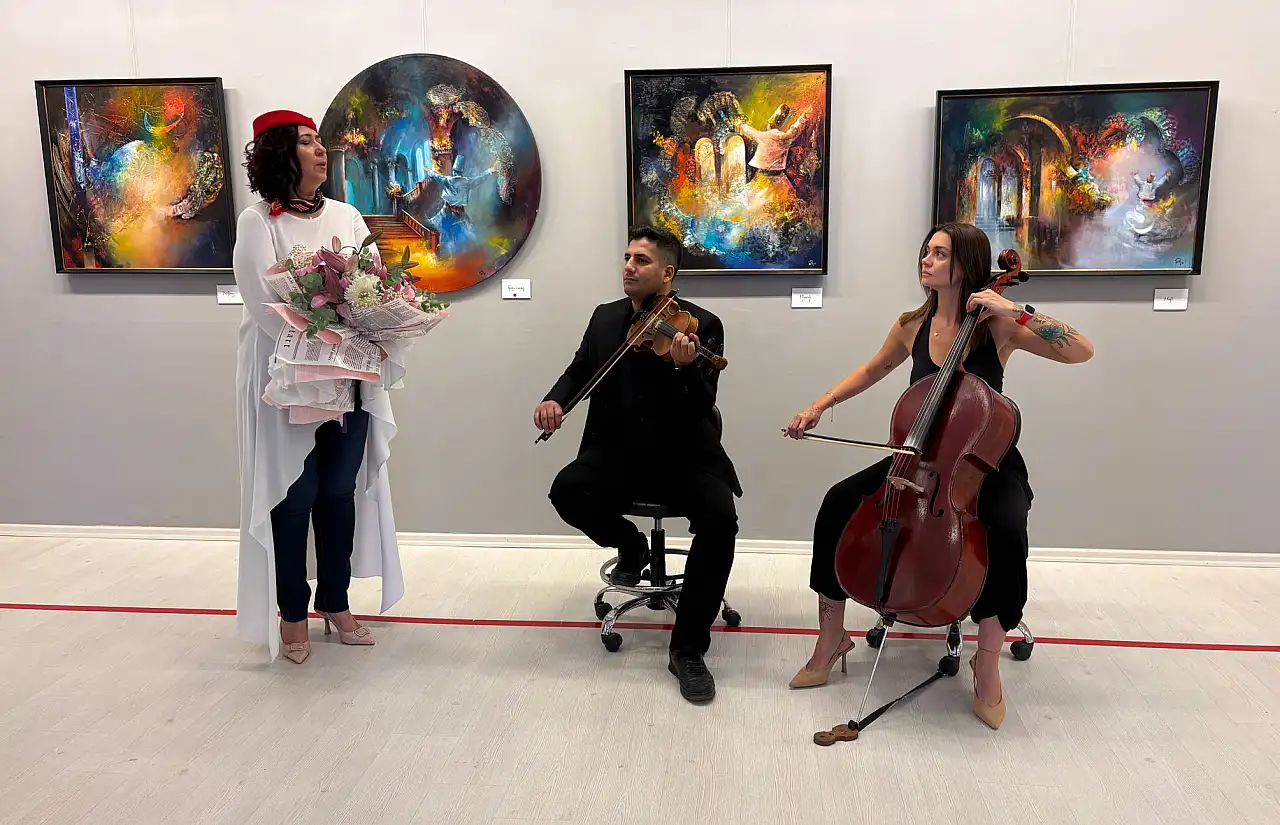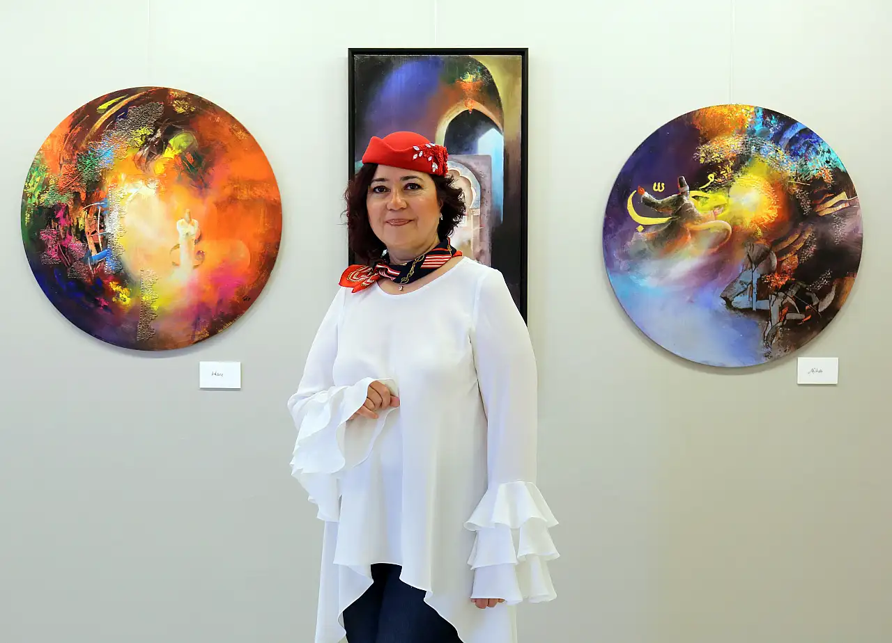 Fatoş Tatar Eker ise sergilediği eserlerinde tasavvufun soyut ve modern sanatla buluştuğu, kendi ruhundan yansıyan renklerin tuvalde birer hikâyeye dönüştüğünü söyledi.