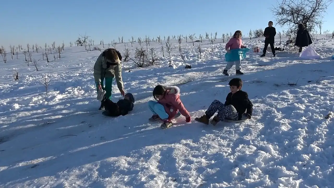 Gaziantep'te etkili olan kar yağışı sonrası boş araziyi kayak pistine çeviren çocuklar, tepsi, poşet ve leğenlerle kayarak doyasıya eğlendi.