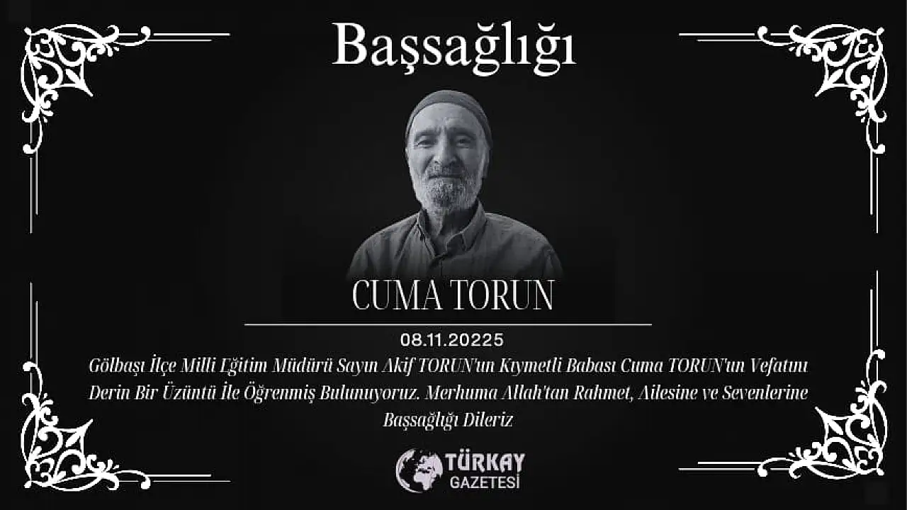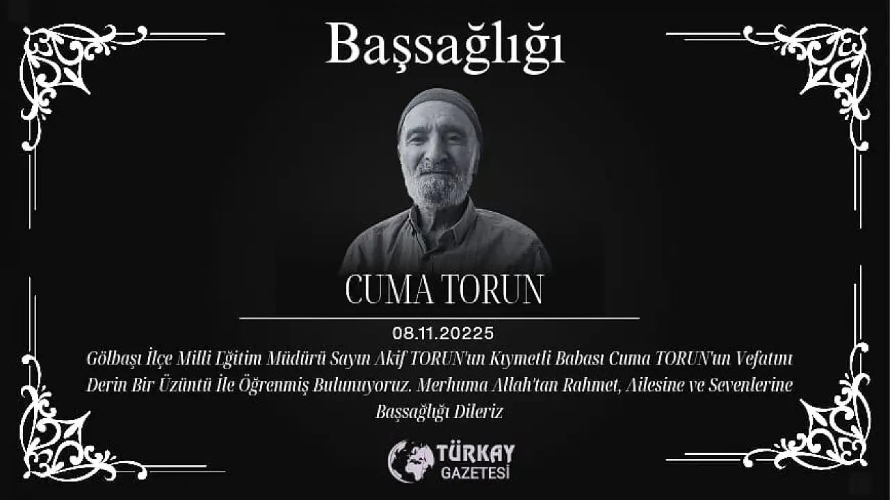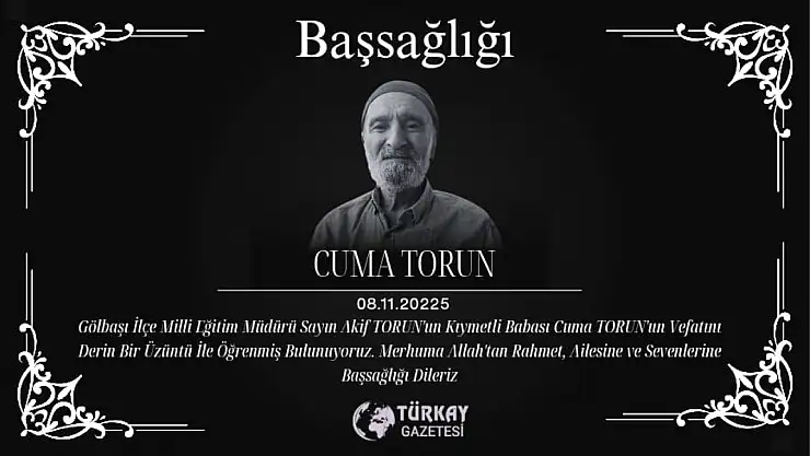 Gölbaşı İlçe Milli Eğitim Müdürü Akif Torun'un babası Cuma Torun vefat etti. İlçe Milli Eğitim müdürlüğü vefatla ilgili başsağlığı mesajı yayınlandı.