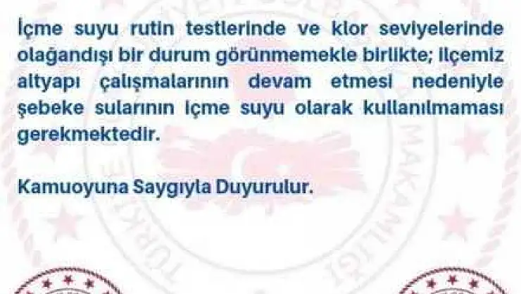 Haber: Mustafa GülKonuyla iglili gölbaşı İlçe kaymakamlığı tarafından yayınlanan duyuruyu aynen paylaşıyoruz;“İçme suyu rutin testlerinde ve klor seviyelerinde olağanüstü bir durum görünmemekle birlikte, ilçemiz altyapı çalışmalarının devam etmesi nedeniyle şebeke sularının içme suyu kullanılmaması gerekkmektedir.”