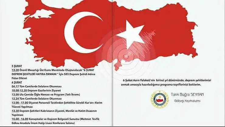 Gölbaşı ilçe kaymakamlığı tarafından 6 Şubat Kahramanmaraş merkezli depremin yıl dönümü dolasıyla anma programı düzenlenecek.