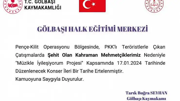 Gölbaşı kaymakamı Tarık Buğra Seyhan 17 Ocak 2024 tarihinde Müzikle iyileşiyorum projesi kapsamında düzenlenecek olan konserin pençe kilit harekatında şehit düşen Mehmetçikler nedeniyle ileri bir tarihe ertelendiğini söyledi.