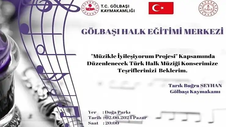 Gölbaşı Kaymakamlığının Müzikle iyileşiyorum projesi kapsamında bugün Gölbaşı Doğa parkında Türk halk müziği konseri düzenlenecek.