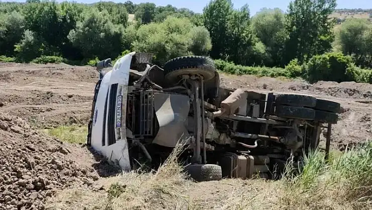Adıyaman'ın Gölbaşı ilçesinde dorsesinde bulunan yükü boşaltan kamyon şarampole devrildi.