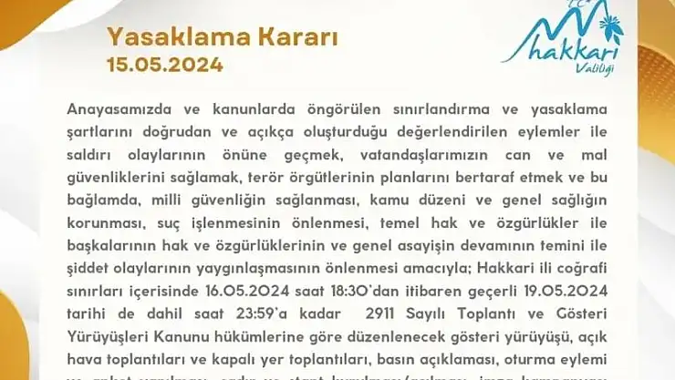 Hakkari Valiliği tarafından yapılan açıklamada, "Anayasamızda ve kanunlarda öngörülen sınırlandırma ve yasaklama şartlarını doğrudan ve açıkça oluşturduğu değerlendirilen eylemler ile saldırı olaylarının önüne geçmek, vatandaşlarımızın can ve mal güvenliklerini sağlamak, terör örgütlerinin planlarını bertaraf etmek ve bu meyanda milli güvenliğin sağlanması, kamu düzeni ve genel sağlığın korunması, suç işlenmesinin önlenmesi, temel hak ve özgürlükler ile başkalarının hak ve özgürlüklerinin ve genel asayişin devamının temini ile şiddet olaylarının yaygınlaşmasının önlenmesi amacıyla; Hakkari ili coğrafi sınırları içerisinde 16.05.2024 saat 18.30’dan itibaren geçerli 19.05.2024 tarihi de dahil saat 23.59’a kadar 2911 Sayılı Toplantı ve Gösteri Yürüyüşleri Kanunu hükümlerine göre düzenlenecek gösteri yürüyüşü, açık hava toplantıları ve kapalı yer toplantıları, basın açıklaması, oturma eylemi ve anket yapılması, çadır ve stant kurulması/açılması, imza kampanyası düzenlenmesi, bildiri, broşür ve el ilanı dağıtılması ve her türlü protesto eylemi şeklindeki faaliyetler 2911 Sayılı Toplantı ve Gösteri Yürüyüşleri Kanunu ve 5442 sayılı İl İdaresi Kanununun ilgili maddeleri doğrultusunda yasaklanmıştır" denildi.