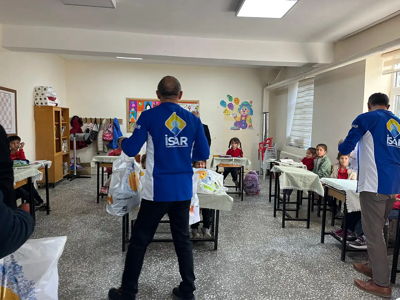 Sarı Harman İlkokulunu ziyaret eden İsar Derneği Adıyaman şube sorumlusu Abuzer Kadir Özkin okul idarecileri tarafından belirlenen ihtiyaç sahibi çocuklara Mont, bot, atkı, bere ve eldiven takımı hediye etti.