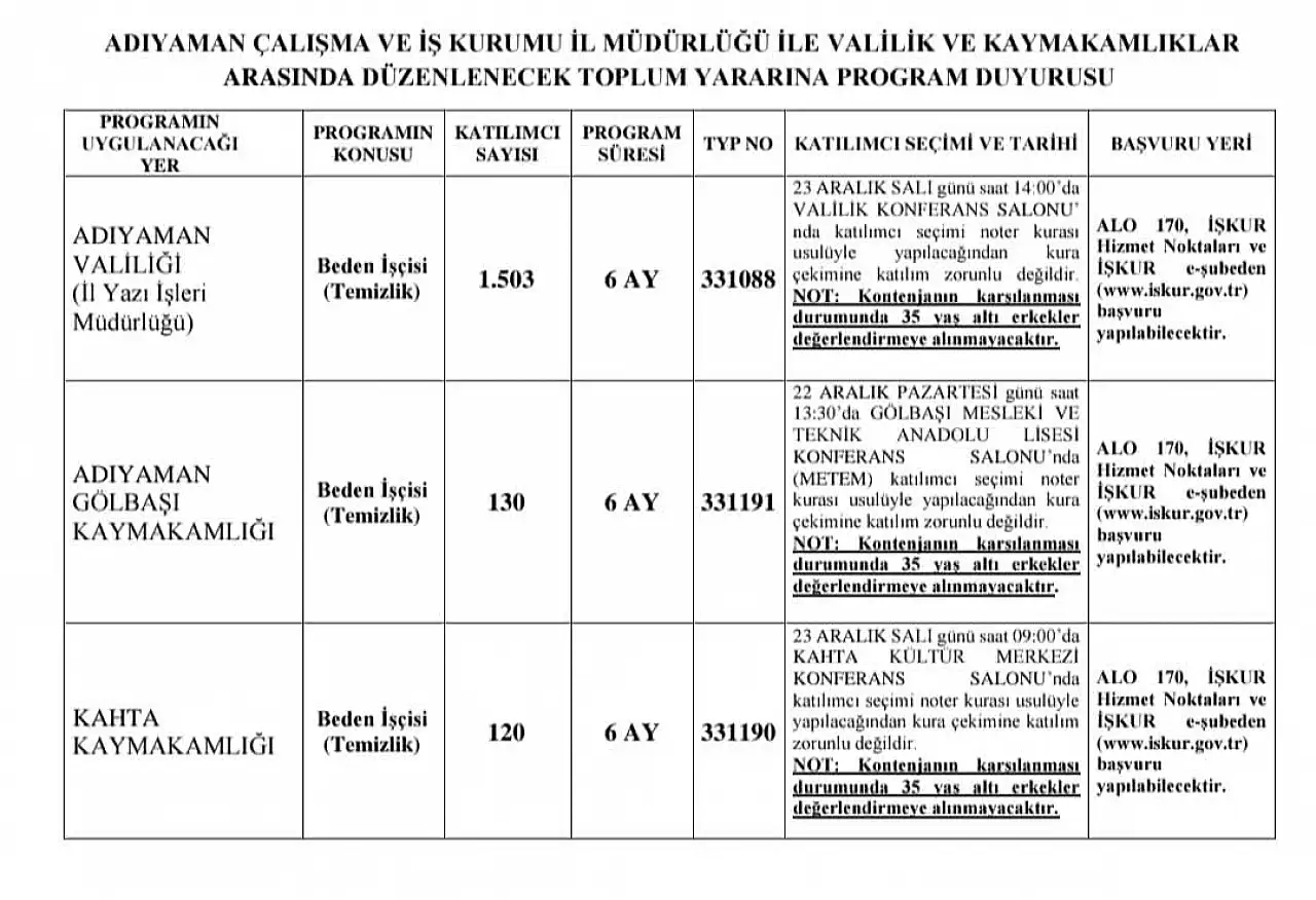 Adıyaman Çalışma ve İş Kurumu İl Müdürlüğü tarafından yayımlanan duyuruya göre, Valilik ve kaymakamlıklar bünyesinde Toplum Yararına Program (TYP) kapsamında toplam 1.810 beden işçisi alınacak. Başvurular 16-20 Aralık 2025 tarihleri arasında yapılacak, program 6 ay sürecek.