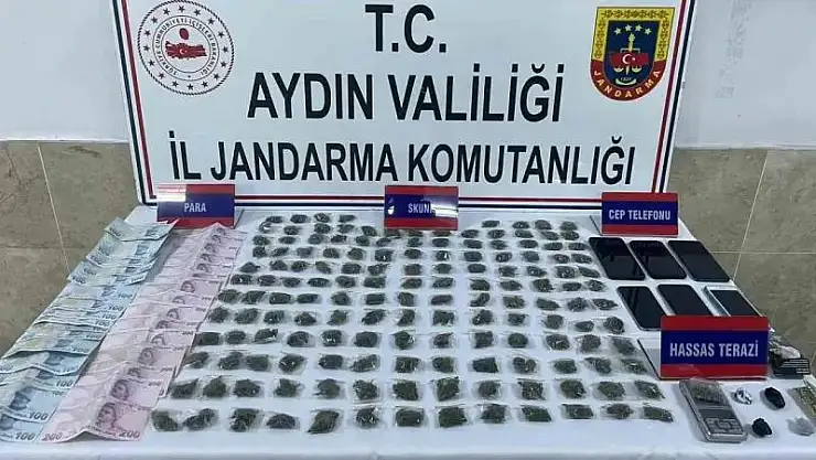 Aydın İl Jandarma Komutanlığı Kaçakçılık ve Organize Suçlarla Mücadele Şube Müdürlüğü ve Nazilli İlçe Jandarma Komutanlığınca uyuşturucu madde imal ve ticaretine yapan şahıslara yönelik çalışma başlatıldı. İzmir’den temin ettikleri uyuşturucu maddeyi Aydın’ın Nazilli ilçesine araç ile getiren T.A., A.P., S.E.A, N.P, T.B isimli şüpheli şahısların İsabeyli Mahallesi’nde araçları durduruldu. Durdurulan araçlarında ve üzerlerinde yapılan aramada 154 adet satışa hazır olarak paketlenmiş toplam 515 gram skunk maddesi, 1 adet hassas terazi, suçtan elde edildiği değerlendirilen nakit para ele geçirildi. Jandarmadaki işlemleri tamamlanarak adli makamlara sevk edilen şüpheli şahıslardan T.B., A.P, S.E.A. tutuklanırken, T.A ve N.P ise adli kontrol kararı ile serbest bırakıldı.