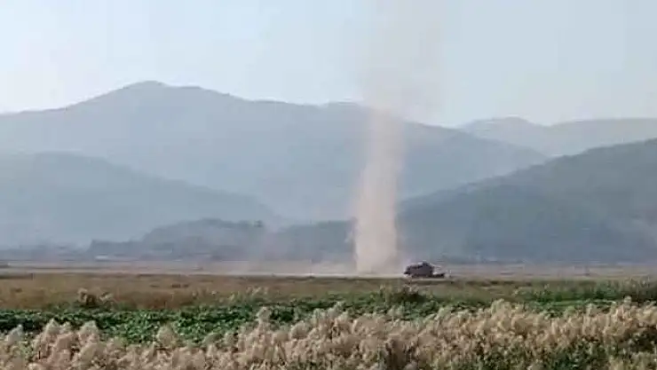 Kahramanmaraş'ta çiftçilerin mısır ve ak darı hasadı yaptığı sırada Gavur Gölü bölgesinde kısa süreli hortumlar çıktı.