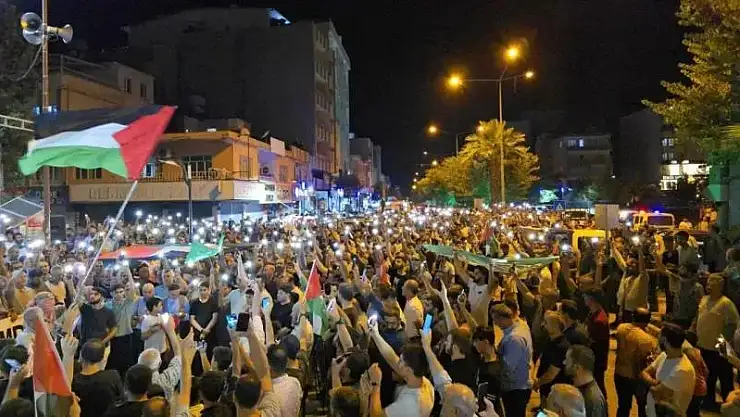 Adıyaman'ın Kahta ilçesinde yaklaşık 5 bin kişi, Kahta STK'lar Platformu çatısı altında bir araya gelerek İsrail'in Gazze'ye yönelik yapılan katliamları protesto edip lanetledi ve Aksa Tufanı'na destek mesajları verdi.