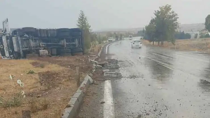 Adıyaman'da kamyon, sürücüsünün direksiyon hâkimiyetini kaybetmesi sonucu kontrolden çıkarak refüje çarpıp devrildi.