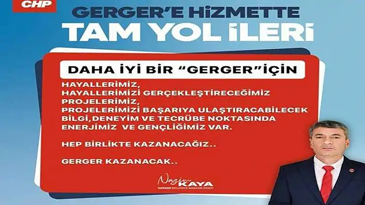 Gerger ilçesinin şimdiye kadar beklediği hizmetleri alamadığını belirten CHP Gerger Belediye Başkan adayı Nazim Kaya; “Hayallerimiz, hayallerimizi gerçekleştireceğimizi projelerimiz, projelerimizi başarıya ulaştırabilecek bilgi, deneyim ve tecrübe noktasında enerjimiz ve gençliğimiz var. Hep birlikte kazanacağız. Haliyle Gerger kazanacak.