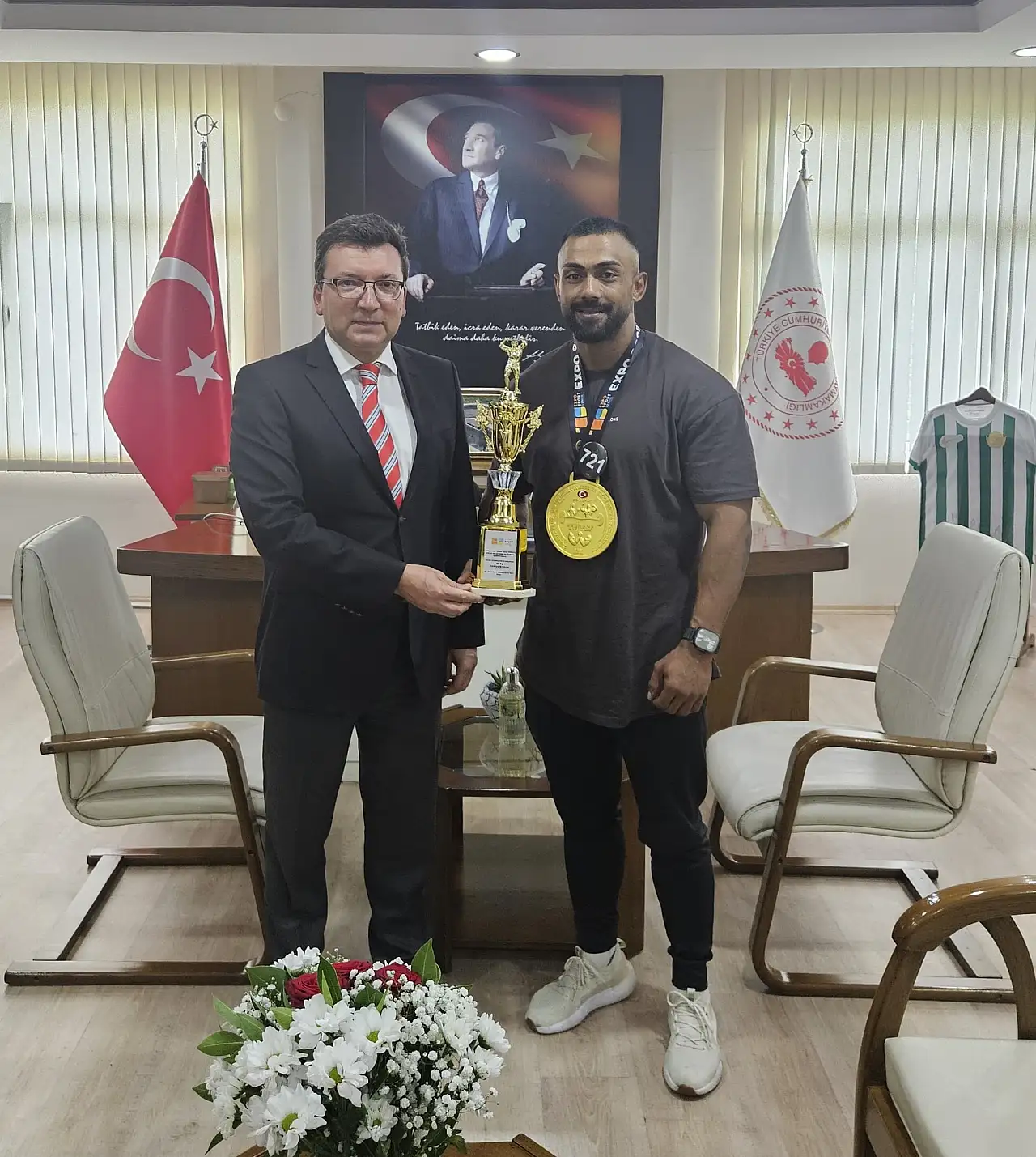 Serik Kaymakamı Dr. Cemal Şahin, 23-27 Eylül tarihleri arasında İzmir EXPO Fuarı'nda düzenlenen Vücut Geliştirme Türkiye Şampiyonası'nda 80 kg kategorisinde Türkiye Şampiyonu olan İbrahim Özyıldız'ı makamında kabul etti.