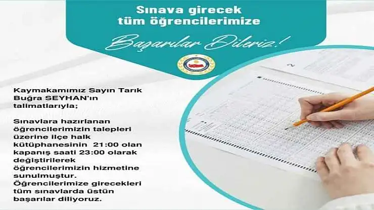 Gölbaşında sınava hazırlanan ve günlük ders çalışan öğrencilerin talebi üzerine harekete geçen Gölbaşı kaymakam Tarık Buğra Seyhan’ın talimatıyla ilçe kütüphanesi sabah 08:00’ de açılıp gece 23:00’de kapatılacak.