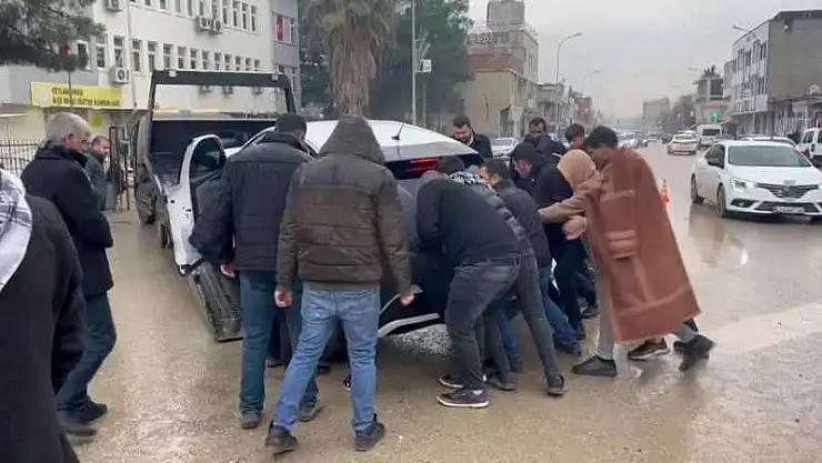 Kaza nedeniyle bölgeye çekici çağrıldı. Halatla bağlanan araçlardan birini çekiciye yüklemeye çalışan görevli, bunu başaramayınca yardımına çevredeki vatandaşlar yetişti. Ön kısmı çekicinin rampasına çıkarılan aracın arka kısmı ise yana doğru kaydı. Vatandaşlar, aracı sallaya sallaya çekiciye yüklemeye çalıştı. Uzun uğraşlar sonucu çekiciye yüklenen araç, güvenli bir yere çekildi.