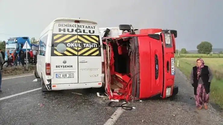 Konya'nın Beyşehir ilçesinde, devrilerek karşı şeride geçen kamyonun minibüsle çarpışması sonucu 14 kişi yaralandı.