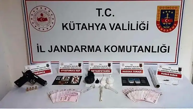 İl Jandarma Komutanlığı unsurlarınca uyuşturucu ile mücadele çerçevesinde yapılan çalışmalar neticesinde Kütahya’nın merkez ilçesi Dumlupınar Mahallesi’nde G.B., H.E., Y.M.A., E.Y., İ.E. ve B.H. isimli şahıslar uyuşturucu madde ticareti yaptıkları esnada suçüstü yakalandı. Olayla ilgili Dumlupınar Mahallesi’nde bir adreste, araçta ve şahısların üzerlerinde yapılan arama sonucu, 92 gram metamfetamin, 2 adet hassas terazi, 2 gram kubar esrar, 22 adet sentetik ecza, 3 adet uyuşturucu madde kullanma aparatı, 1 adet tabanca, 4 adet tabanca fişeği, 1 rulo alüminyum folyo, 11 bin 750 TL suçtan elde edildiği değerlendirilen para ele geçirildi.