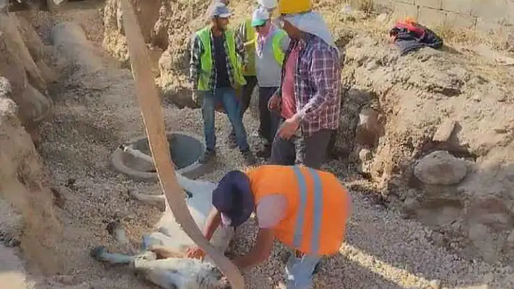 Hatay'da kuyuya düşen eşek, ekiplerin iş makinasıyla yürüttüğü çalışmayla kurtarıldı.
