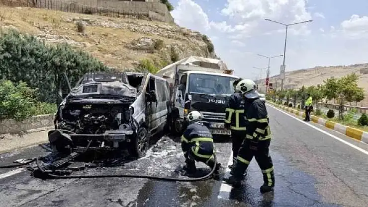 Mardin'in Artuklu ilçesinde seyir halinde olan hafif ticari araç alevlere teslim oldu.