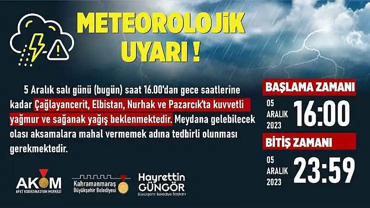 Kahramanmaraş Büyükşehir Belediyesi bünyesinde faaliyetlerini sürdüren Afet Koordinasyon Merkezi (AKOM), 5 Aralık Salı günü (bugün) saat 16.00’dan gece saatlerine kadar Çağlayancerit, Elbistan, Nurhak ve Pazarcık’ta kuvvetli yağmur ve sağanak yağış beklendiğini duyurdu. Sağanak yağışlar neticesinde meydana gelebilecek olası sel, su baskını ve ulaşımda aksamalar gibi olumsuzluklara karşı dikkatli ve tedbirli olunması noktasında vatandaşlar uyarılırken, Büyükşehir Belediyesinden yapılan açıklamada; kuvvetli yağışlar neticesinde meydana gelebilecek olası aksamalara mahal vermemek adına tüm önlemlerin alındığı, ekiplerin teyakkuz halinde olduğu ve herhangi bir olumsuzlukla karşılaşılması durumunda vatandaşların 112 Acil Çağrı Merkezi’nden İtfaiye ekiplerine ve ALO 153’ten Afet Koordinasyon Merkezi’ne (AKOM) ulaşabilecekleri belirtildi. Haber Merkezi