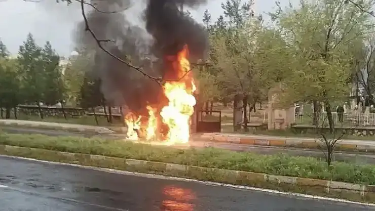 Mardin'in Midyat ilçesinde mezarlığa giden ailenin otomobili alevlere teslim oldu.