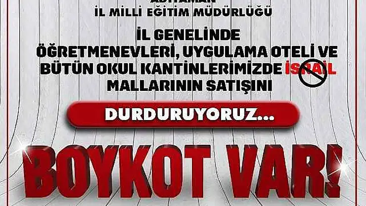 Adıyaman İl Milli Eğitim müdürü Ali Tosun, İsrail devletinin Filistin'de uyguladığı soykırıma tepki amaçlı milli eğitim müdürlüğüne bağlı kurumlarda İsrail menşeli ürünlerin alınmaması ve satılmaması yönünde boykot kararı aldıklarını açıkladı.